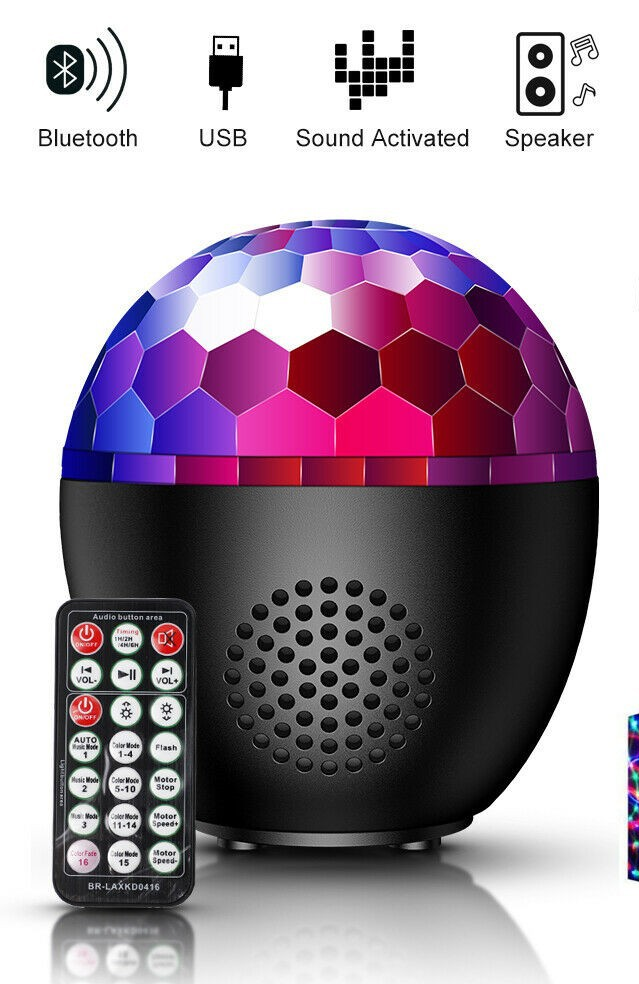 Discokule med 15 fargemoduser/mønstre, lysstyrkekontroll, god bass-lyd i høyttaleren.